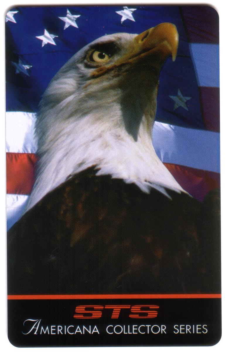 The Americana Collector Series by STS is a complete set of 12 collectible phone cards featuring iconic symbols and landmarks of American history. Each card displays a distinctive image related to Americana, with the STS logo and "Americana Collector Series" text at the bottom on a black background with a red accent line.