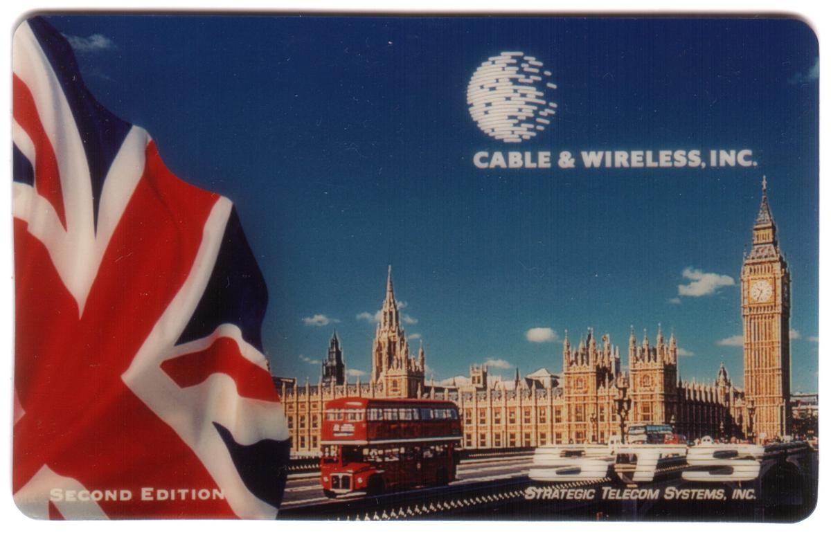 The card includes the logo and text for Cable & Wireless, indicating its association with C&W (Cable & Wireless International). The overall design blends urban elements with recognizable British imagery to create a detailed representation of London’s cityscape. The clock on Big Ben is clearly showing its face, and there are some abstract shadow effects across the background that enhance the card’s depth.
