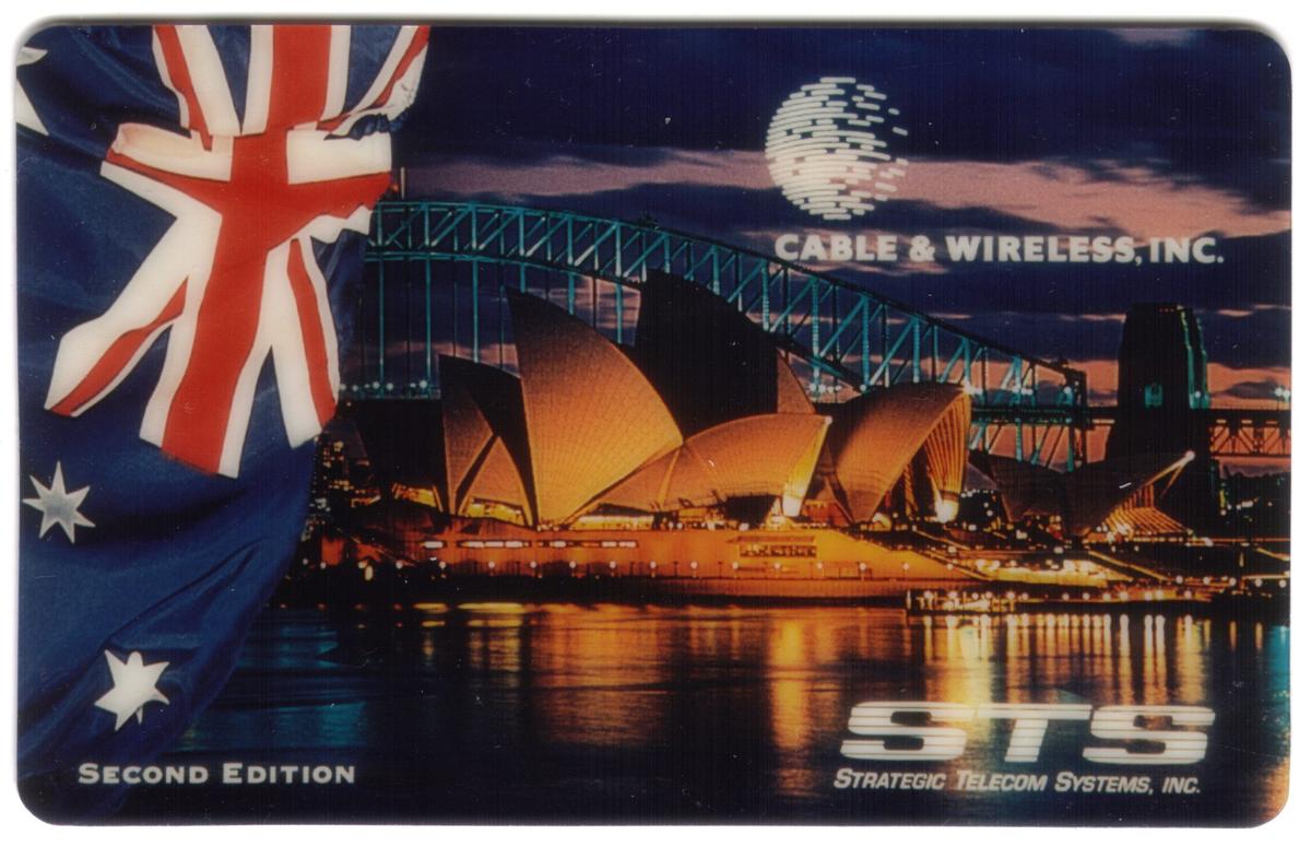Printed text on the card identifies it as part of the "Cities of The World 2" series and includes the name "Sydney Australia Opera House & Flag." The card also bears the logo and name of Cable & Wireless ("C&W"), a telecommunications provider, along with references to "cwi" and "Strategic Telecom Sys." The card value is shown as 10m, indicating its use for telephone credit.