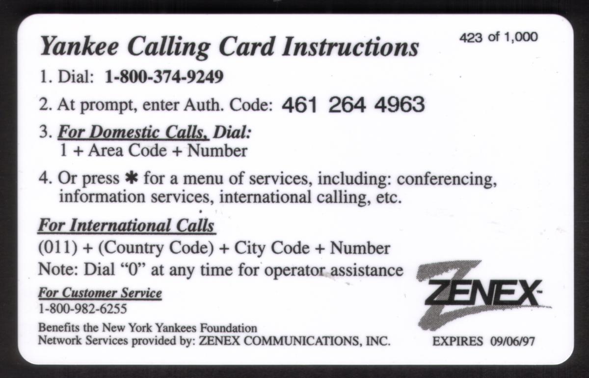This phone card is linked to the New York Yankees and references themes such as baseball, MLB, and the National Baseball Hall of Fame. It associates with the player Dwight Gooden and benefits the New York Yankees Foundation. The card is part of the New York Yankees Series titled "Yankee Stadium: Home of The New York Yankees" and was produced by Zenex and Strategic Telecom Sys.