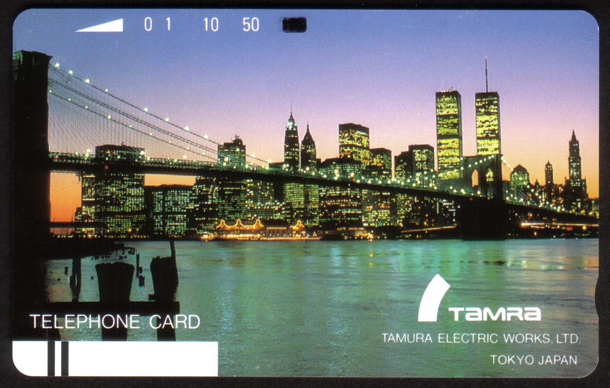At the top of the card, a series of numbers "01 10 50" is printed near a small black rectangular mark, likely indicating value or usage increments. The overall design underscores a connection between Tokyo-based Tamura Electric Works and New York City, showcasing both landmarks and corporate branding on this collectible item.