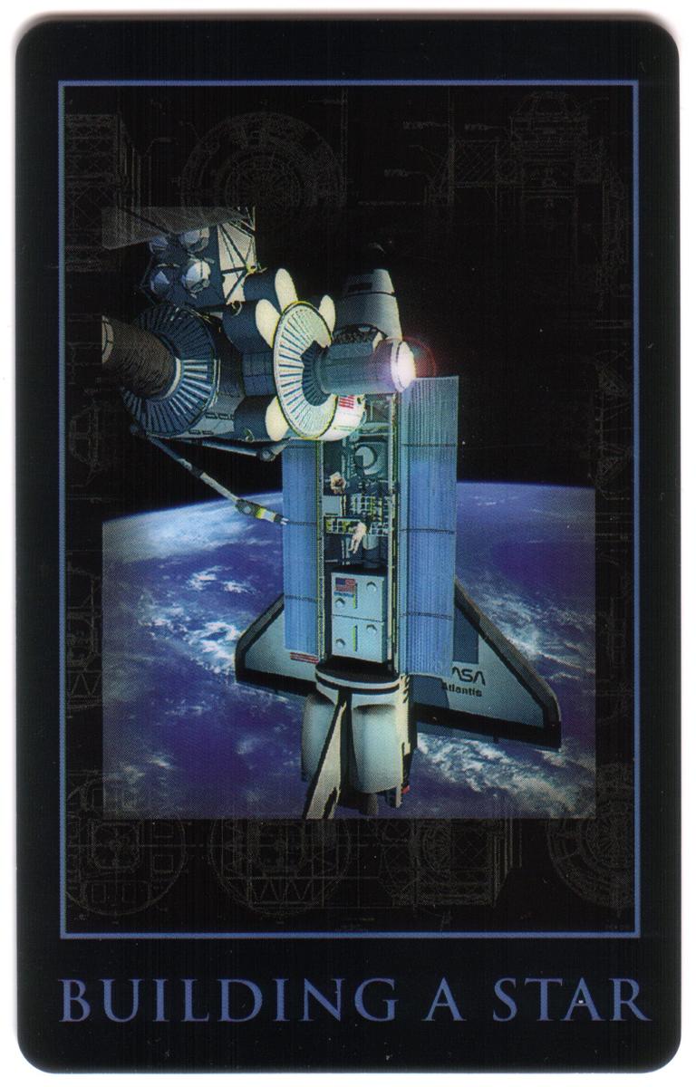 The card’s design incorporates elements of fantasy art style while maintaining the realistic portrayal of NASA spacecraft and space station modules. The imagery and text collectively celebrate space exploration, Earth seen from orbit, and the technology involved in the Shuttle program’s journey beyond the atmosphere. The card is a tribute to the ongoing collaboration and achievements in human space travel.
