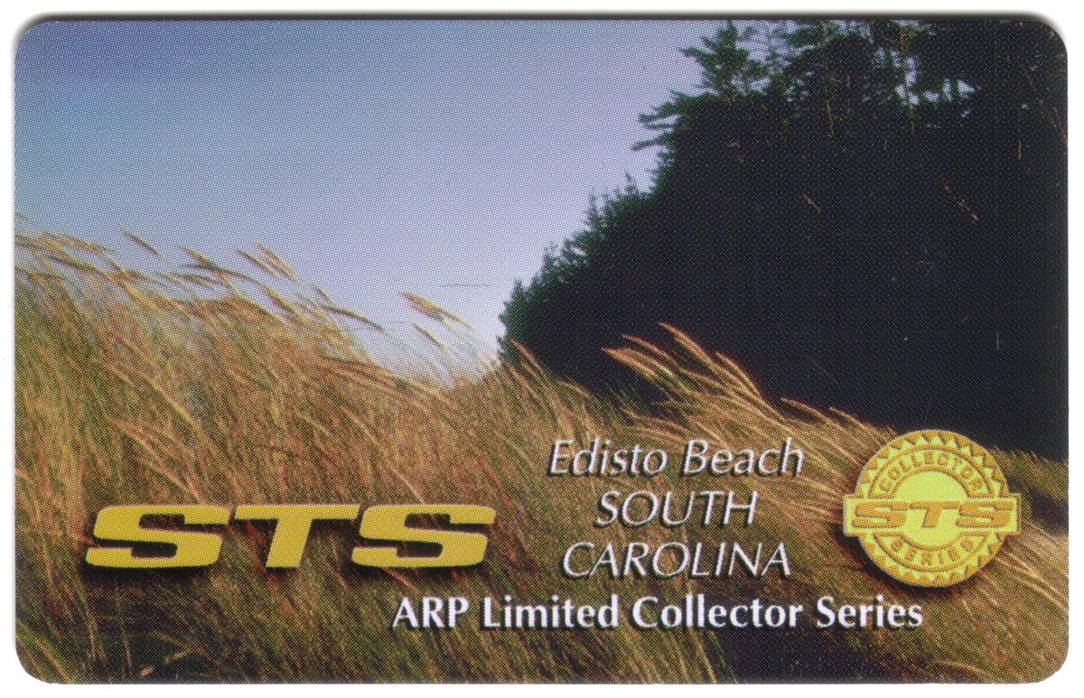 Designed as a collectible phone card, it includes the logo and branding of Strategic Telecom Systems. The overall presentation is clean and focused on the landscape image of Edisto Beach, making it a valuable item for collectors interested in scenic cards within the ARP Series from ZENEX.