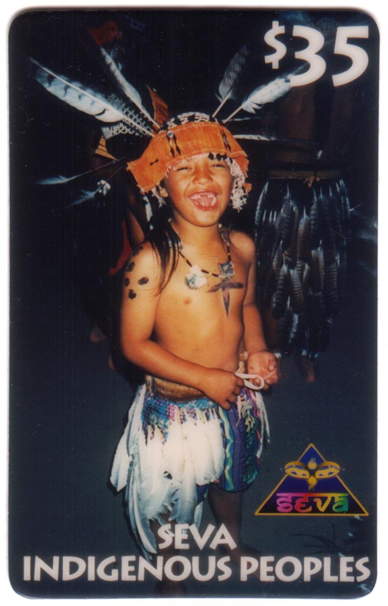 This collectible phone card features the logo and mission statement of the Seva Foundation, an organization composed of doctors, professors, and social activists dedicated to relieving suffering and building communities. The card highlights efforts focused on indigenous peoples, children, and diabetes programs in Guatemala and Mexico, underscoring the foundation's commitment to global health and community development.