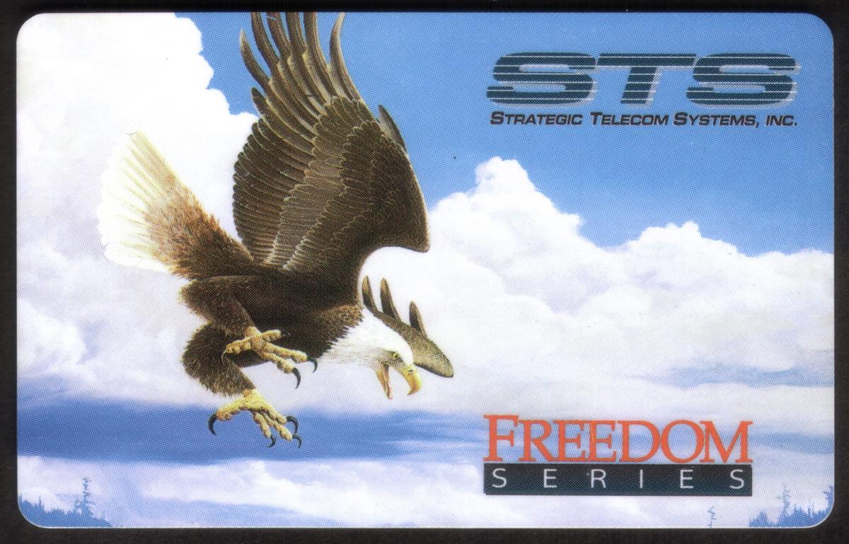 The card includes the text "Freedom Series: Eagle Attacks From Clouds (Exp 08/96)" printed clearly on the front, indicating it is part of a thematic series released in August 1996. Other printed information includes "CCI Network," "Petracom," and "Strategic Telecom Sys." These names represent the entities involved in the production or distribution of the card. The card’s overall color scheme uses earthy tones for the eagle with shades of white and gray in the clouds, reinforcing the natural and patriotic symbolism.