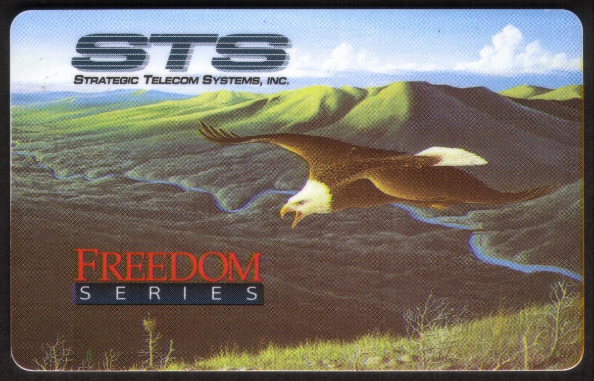 Overall, this card combines patriotic symbolism with natural imagery, showcasing the eagle as a representation of freedom set against the backdrop of American mountains. It is a collectible phone card issued by Strategic Telecom Systems and affiliated networks, designed for users and collectors interested in iconic birds and Americana themes.