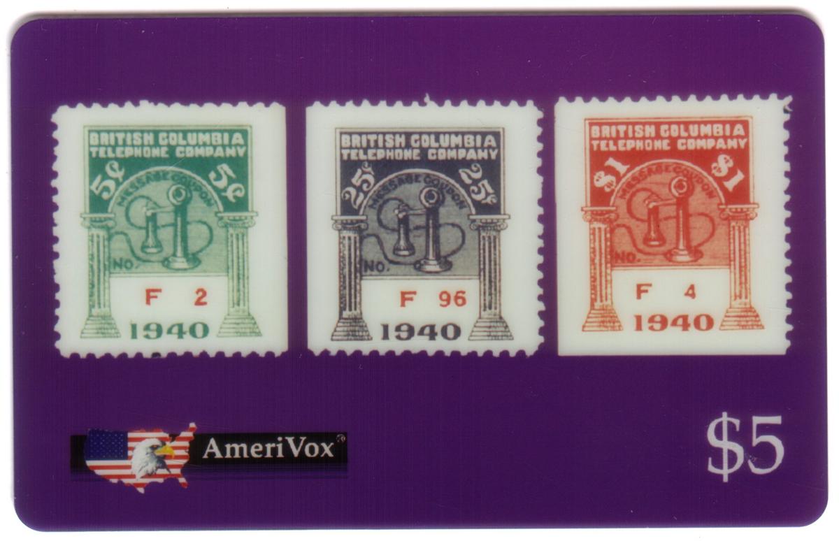 This collectible phone card features three vintage British Columbia Telephone Company stamps from 1940. Each stamp displays the company’s name at the top with a detailed image of an old-fashioned telephone in the center. The stamps are in different colors: green (5 cents), black (25 cents), and orange (1 dollar). Each stamp includes a unique number—F 2, F 96, and F 4 respectively—printed in red below the telephone image, along with the year "1940." The card has a rich purple background with the AmeriVox logo and a $5 value prominently displayed in white on the lower right corner.