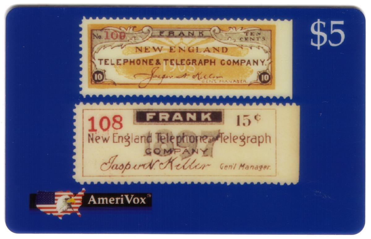 The third collectible phone card presents two New England Telephone & Telegraph Company stamps. The stamps include signatures of Jasper N. Keller, General Manager. The top stamp is labeled "FRANK" with a value of ten cents, number 108 in red, and the company name in a stylized font along with a franchise seal. The bottom stamp also says "FRANK" with a 15-cent value and the number 108 in red, with the full company name beneath. Both stamps have a vintage, aged appearance with intricate border designs. The background of this card is a strong blue, featuring the AmeriVox logo at the bottom left and a $5 value in the upper right corner.