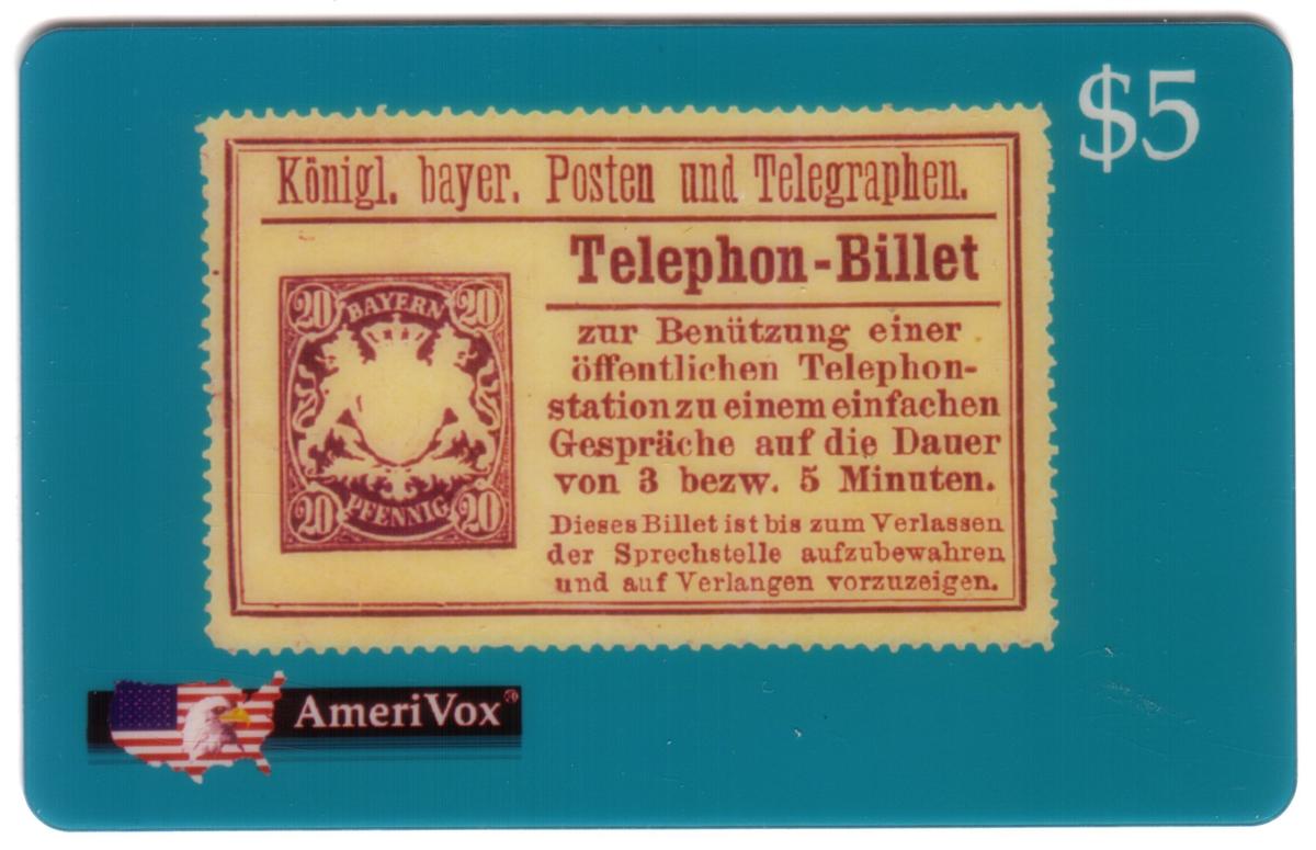 Another collectible phone card shows an antique German telephone ticket labeled "Königl. bayer. Posten und Telegraphen." The beige and maroon ticket includes German text describing its use for a public telephone station, allowing calls of 3 or 5 minutes. The ornate ticket design features decorative borders and old-style Gothic script. This phone card’s background is teal blue with the AmeriVox logo in the lower left corner and "$5" printed in white in the upper right corner.
