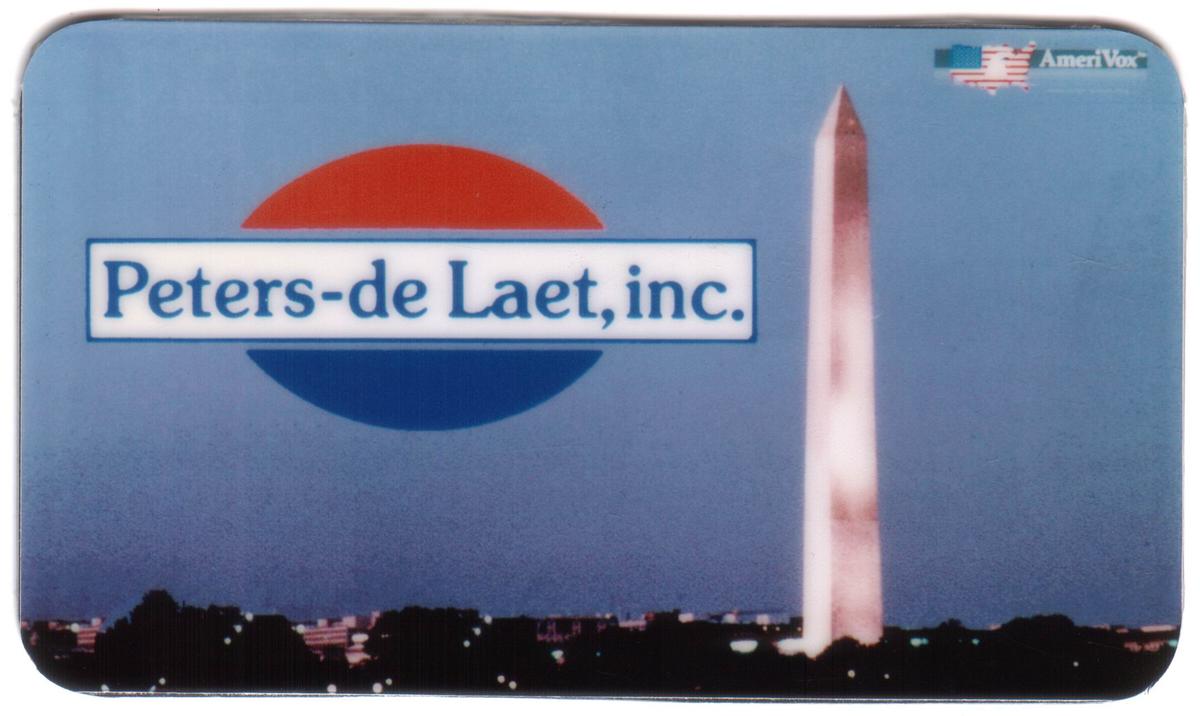 Centered on the card’s upper-midsection is a logo with the text “Peters-de Laet, inc.” inside a white rectangular box. This text is placed over a background of a two-tone circular design, split into a red upper half and a blue lower half. In the top right corner of the card, there is a small American flag graphic accompanied by the text “AmeriVox.”