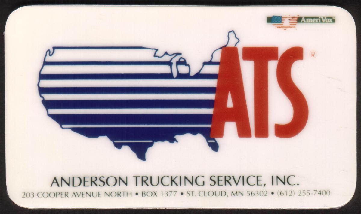 This collectible phone card features the logo and branding of ATS Anderson Trucking Service, a well-known company in the trucking industry. The card incorporates a detailed map of the United States with marked routes representing the company's service areas, highlighting the company’s national reach. The name "Anderson Trucking Service" appears near the map, emphasizing the trucking theme.