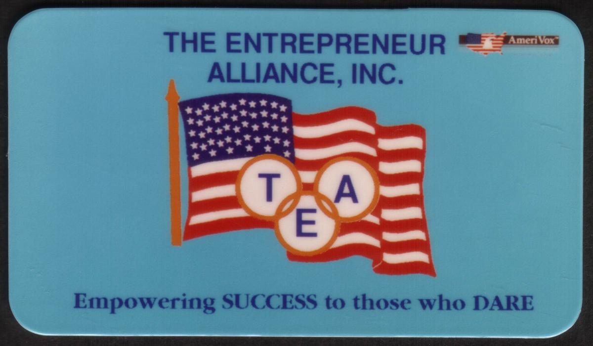 This collectible card features the logo of The Entrepreneur Alliance, Inc. at its center, with a detailed graphic of an American flag waving on a light blue background. The flag is stylized with three intersecting orange circles over the flag's stripes, each containing a bold blue letter: "T," "E," and "A," representing the acronym for The Entrepreneur Alliance. Above the flag and acronym is the text "THE ENTREPRENEUR ALLIANCE, INC." in uppercase dark blue letters. In the top right corner is a small logo for AmeriVox, which includes a miniature American flag.