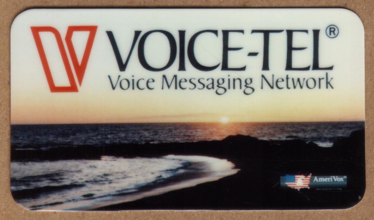 In the bottom right corner of the card, there is a small American flag icon next to the word "AmeriVox," indicating the issuing company or brand. The overall design is clean and professional, emphasizing the VOICE-TEL voice messaging service with the tranquil ocean sunset backdrop. No other text or graphics are present on the front side of the card. This card measures BC Business Card Size and dates from 1992.