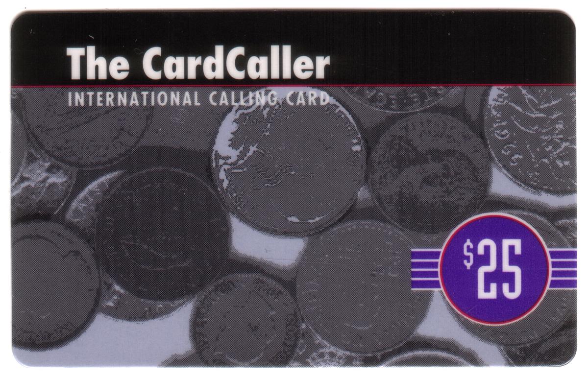 Overall, this collectible card focuses on world coins and money as its main theme, with clear, legible print identifying its $25 value and the entities WorldCom and CardCaller, Inc. It combines visual elements of numismatic interest with branding and monetary denomination in a layout that highlights the collectible aspect of the card.