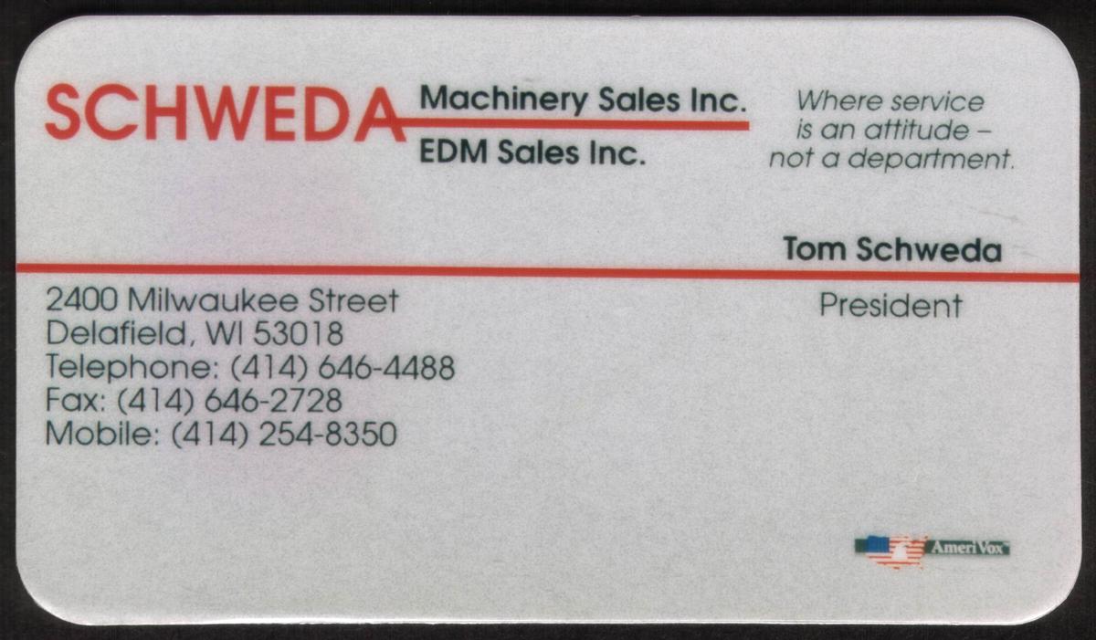 This collectible card features a business card design for Schweda Machinery Sales Inc. and EDM Sales Inc., located at 2400 Milwaukee Street, Delafield, Wisconsin, 53018. The card displays the name Tom Schweda, who holds the title of President. The tagline on the card reads, "Where service is an attitude – not a department."