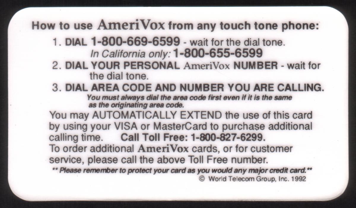 In the bottom right corner, there is a small AmeriVox logo featuring an American flag, confirming its association with AmeriVox. The card is sized like a traditional business card and is dated 1992.