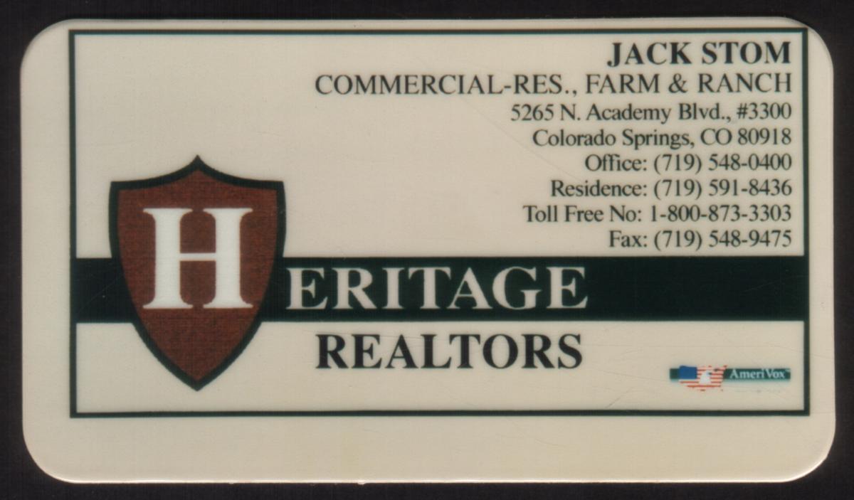 This collectible card features the contact information for Jack Stom of Heritage Realtors, specializing in commercial, residential, farm, and ranch real estate. The card prominently displays the Heritage Realtors logo, which includes a large capital "H" inside a red shield on the left side. The word "HERITAGE" is centered in bold, white capital letters on a black horizontal bar that crosses the shield, with the word "REALTORS" below in black capital letters on a white background.