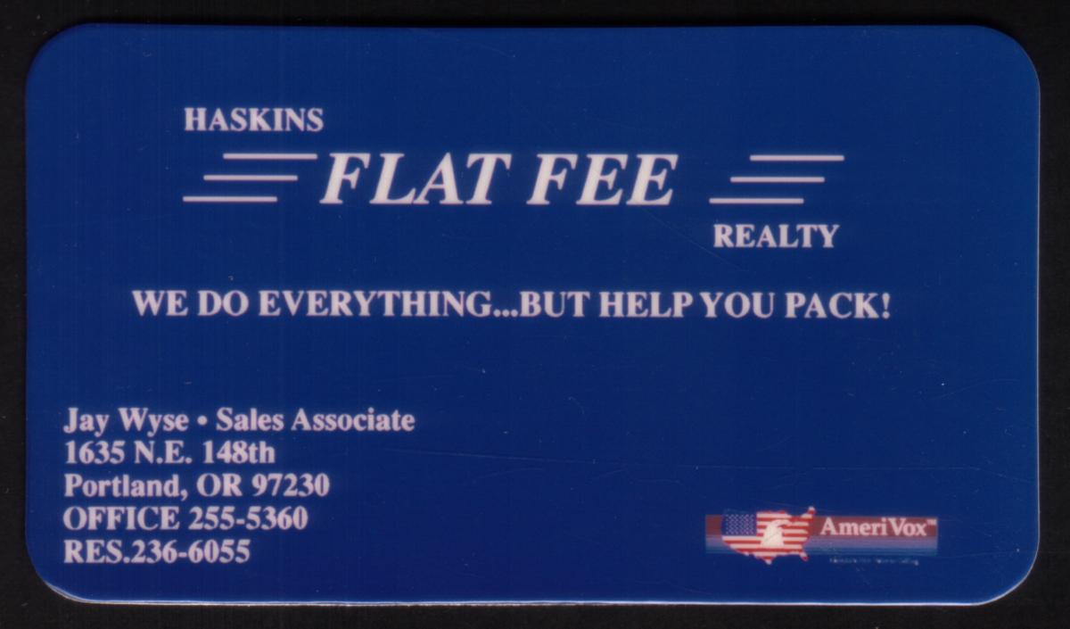This card dates back to 1992 and is associated with Portland, Oregon. The layout, colors, and typography emphasize clear, direct communication for real estate services offered by Haskins Flat Fee Realty and its sales associate Jay Wyse.