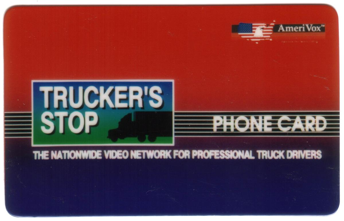 Additional text on the card identifies AmeriVox as the providing company. There are no other characters or logos present beyond the large image of the semi-truck, the truck stop, and the corporate branding. The card’s layout and imagery emphasize professionalism within the trucking industry and the network’s broad reach within this community.