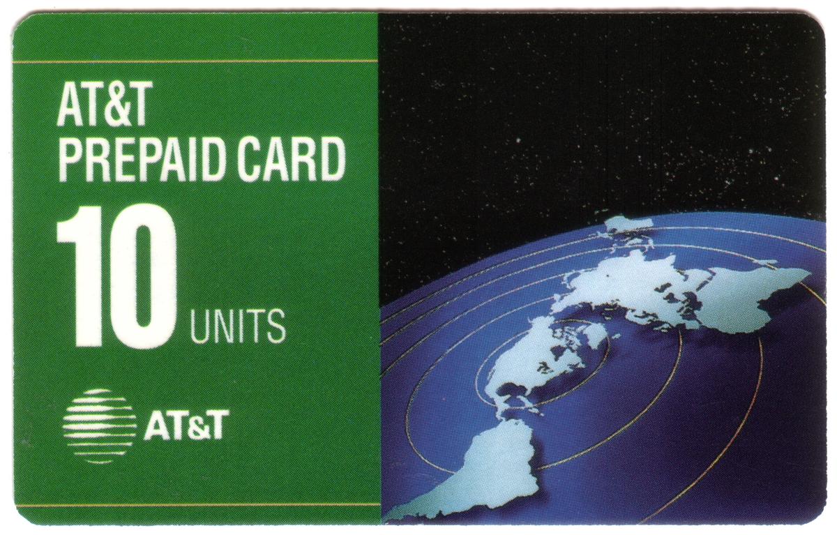 This collectible prepaid card from AT&T features a striking design centered on a flat map of the continents. The card is labeled "AT&T PREPAID CARD" in white text on a green vertical stripe on the left side. Below this text, "10 UNITS" is prominently displayed, indicating the card's value. The official AT&T globe logo appears beneath the units information.