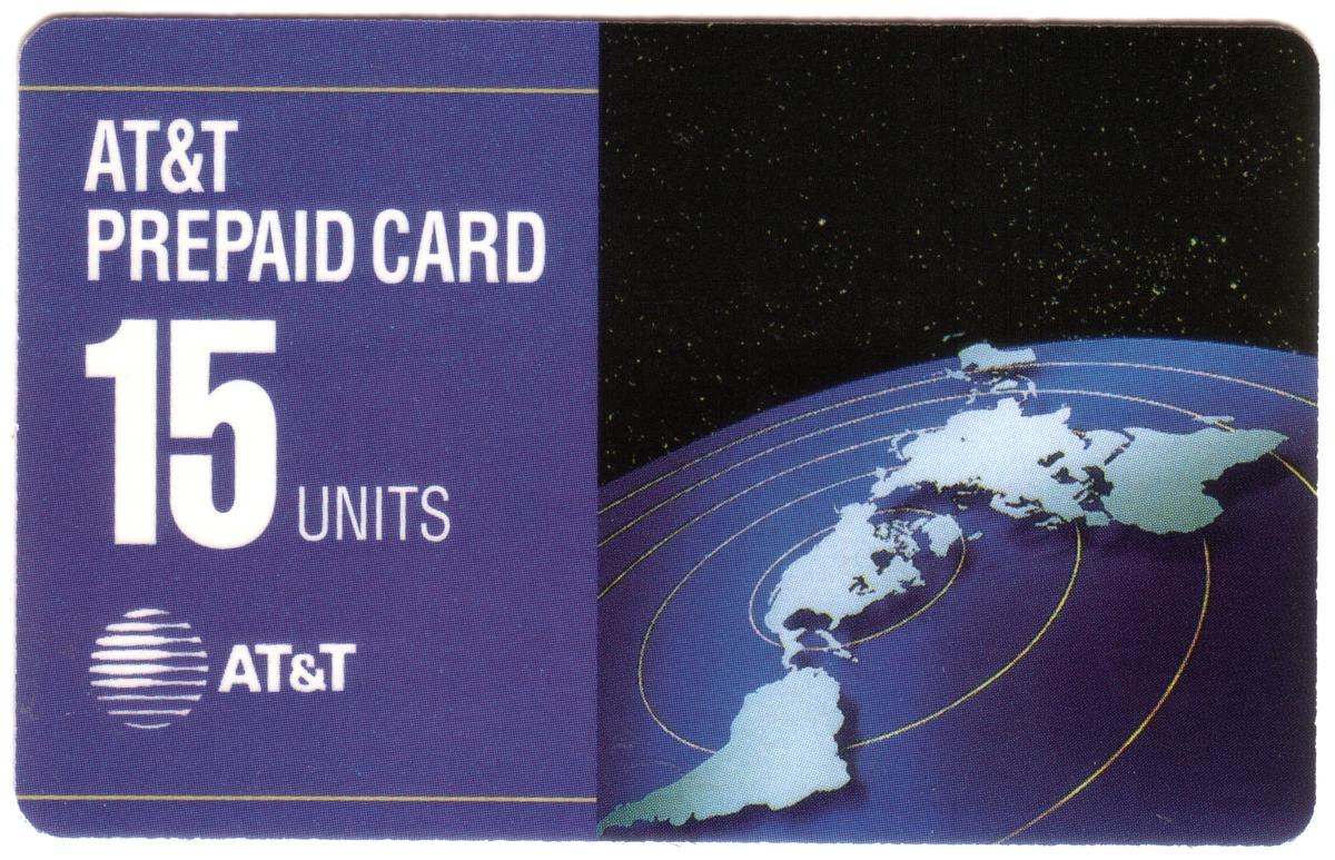 Dominating the design is the map itself, giving a clear representation of the Earth’s land distribution. The card also displays the AT&T logo, reinforcing its association with telecommunications. This card is a collectible prepaid phone card issued by AT&T in 1993, highlighting the globe and outer space themes through the flat map presentation of the Earth’s continents.