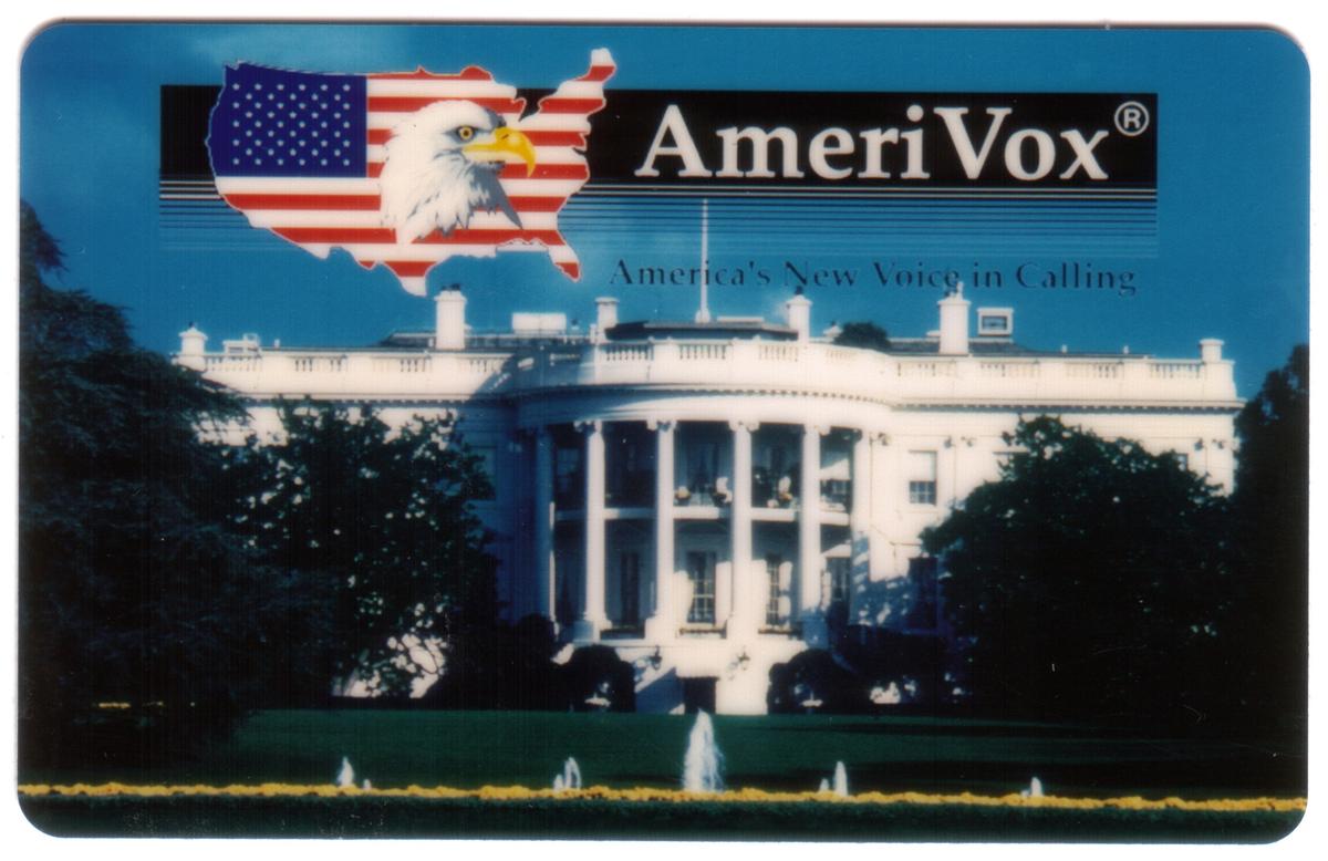 In the upper left corner, the card displays the AmeriVox logo, which consists of a bald eagle's head superimposed on a map of the United States filled with the American flag design. The text "AmeriVox" is printed in white and placed next to the logo, with the tagline "America's New Voice in Calling" in smaller, light blue letters below.