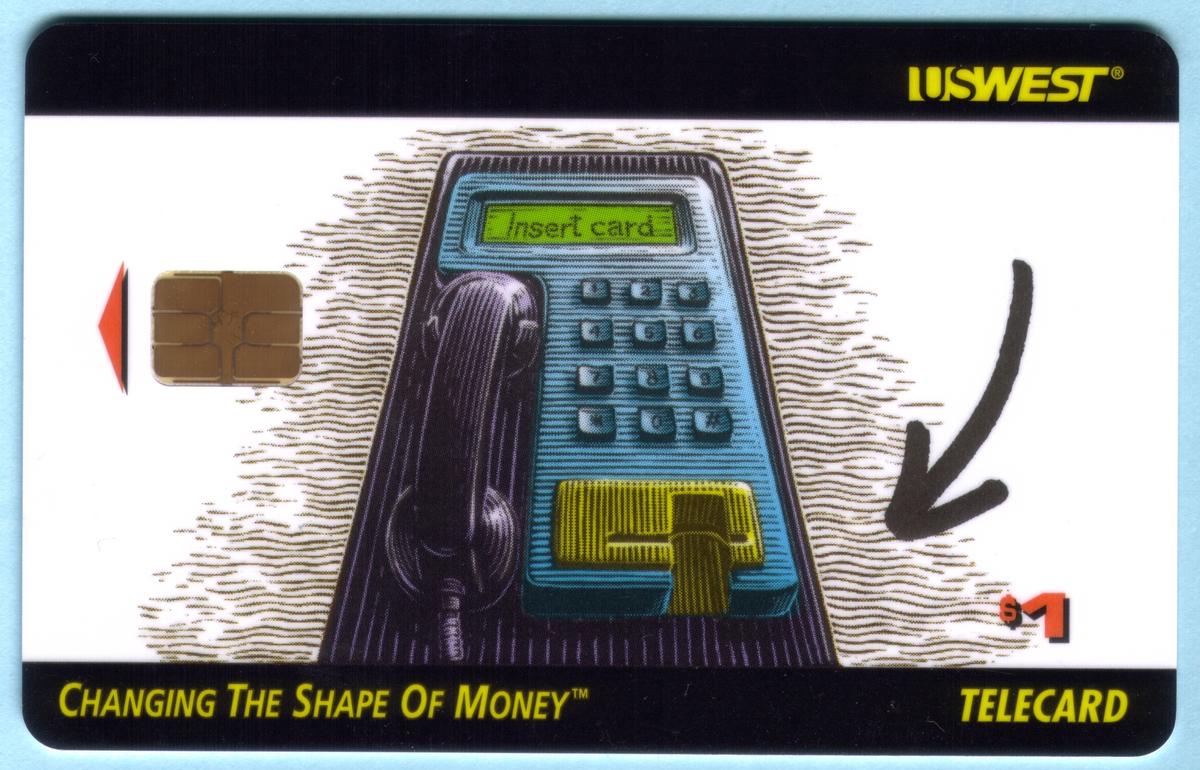This collectible chip card features an illustration of a payphone with a keypad and a digital display that reads "Insert card." The payphone is depicted with a handset attached to its side and a slot for card insertion highlighted in gold. The word "USWEST" appears in yellow capital letters at the top right corner of the card.
