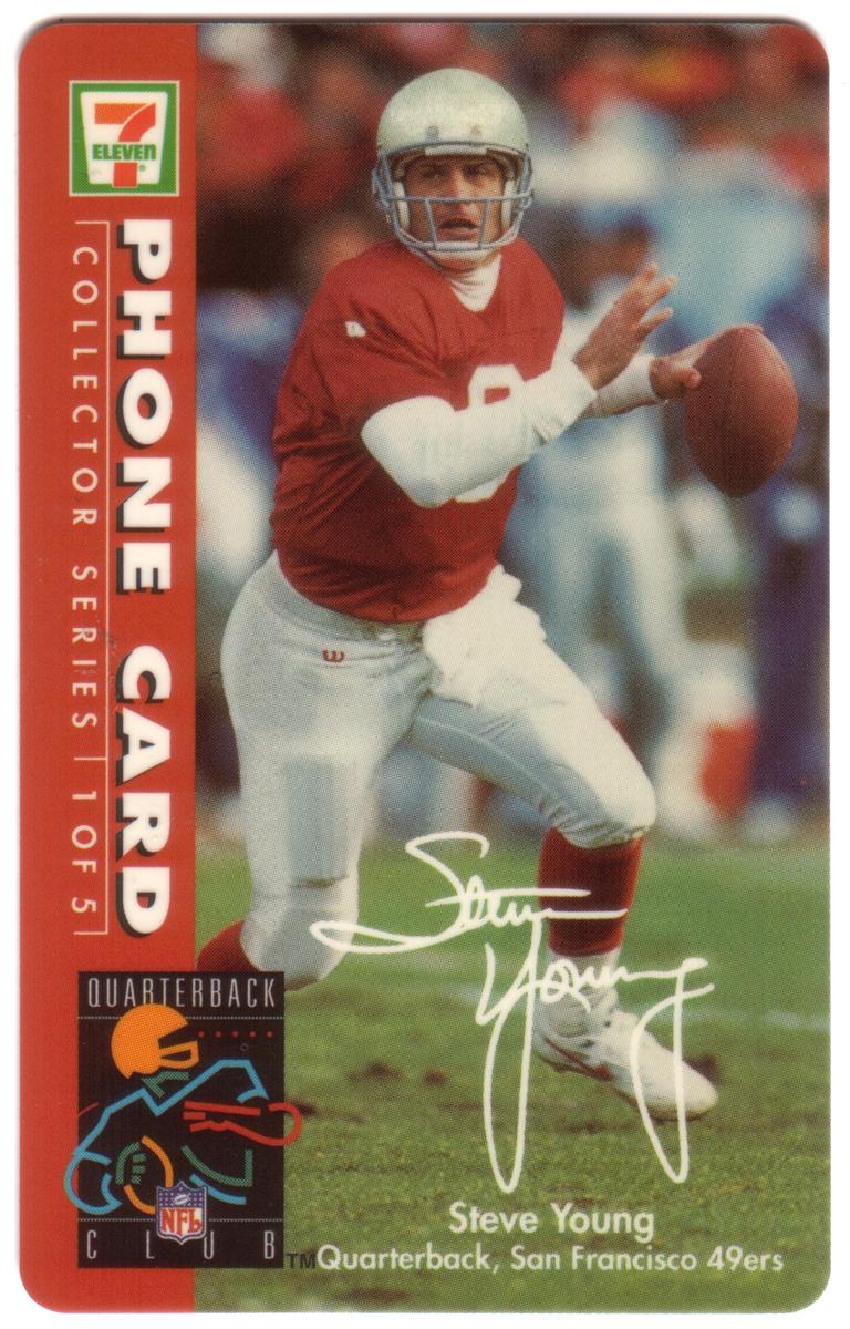 The first card depicts Steve Young, quarterback for the San Francisco 49ers, wearing a red jersey with white pants, in a classic passing pose. His autograph is printed in white near the bottom of the card, alongside the text "Steve Young" and his position and team.