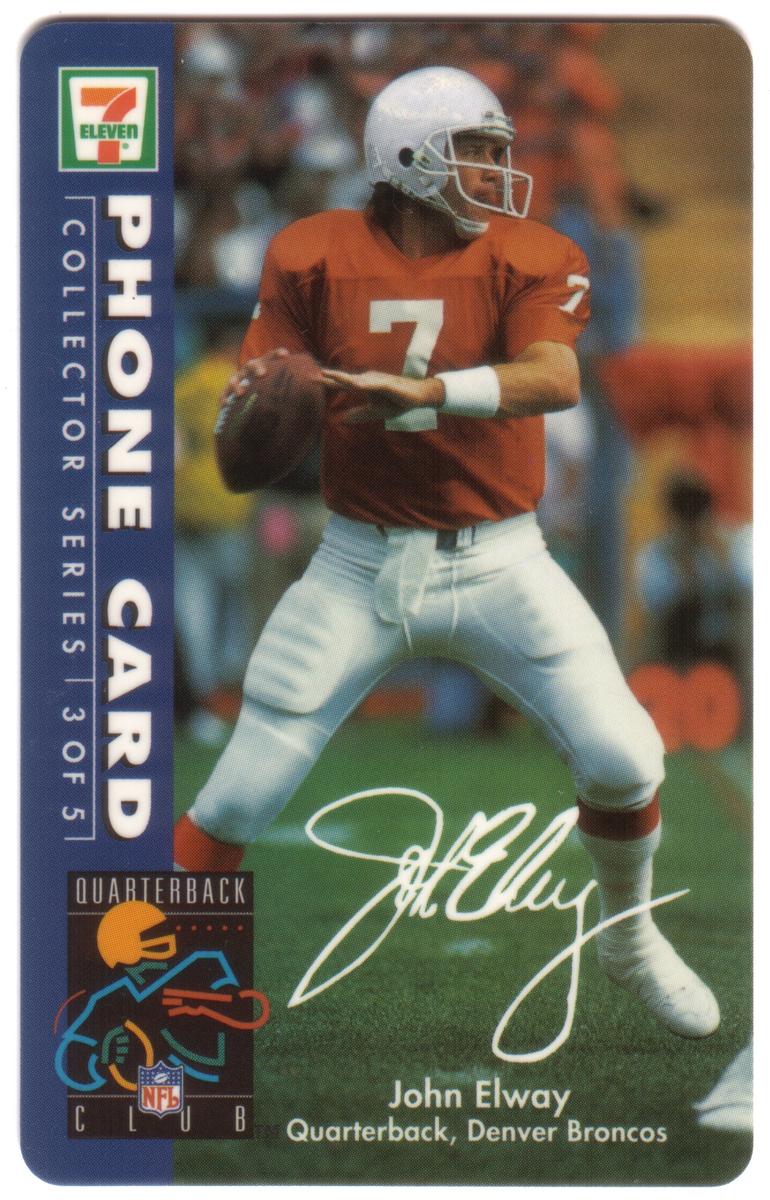 John Elway appears on the third card as the quarterback for the Denver Broncos, wearing a burnt orange jersey and white pants, mid-throw. His autograph is featured near the bottom, with his name and team listed.