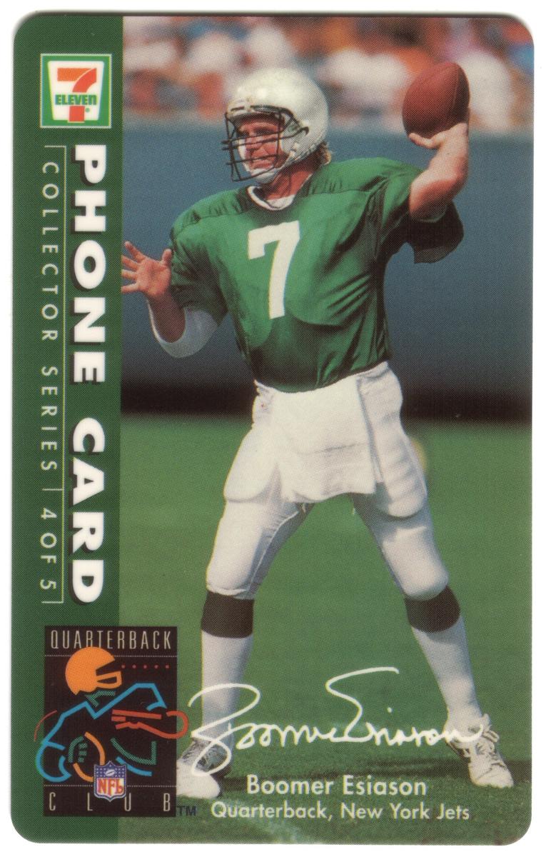 The fourth card features Boomer Esiason, quarterback for the New York Jets, outfitted in a dark green jersey with white pants. He is shown throwing the football with his printed signature beneath him.