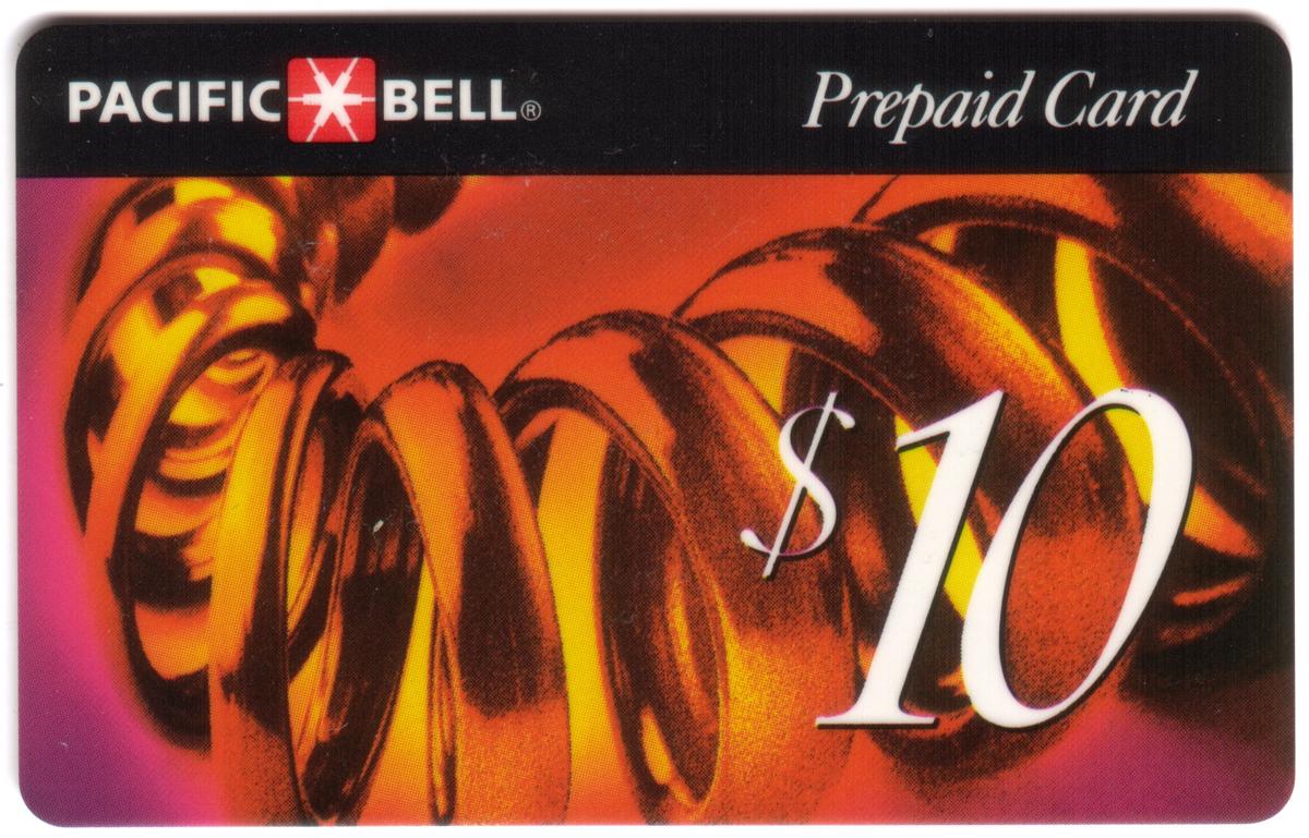 Each card highlights classic telephone imagery, with detailed illustrations of various telephone models and phone keypads. The cards emphasize the Pacific Bell brand name, which appears prominently on the front. The cards' layout complements the theme of communication technology, focusing on telephones as the central subject. The golden cord runs across multiple cards, tying the designs together visually within the set.