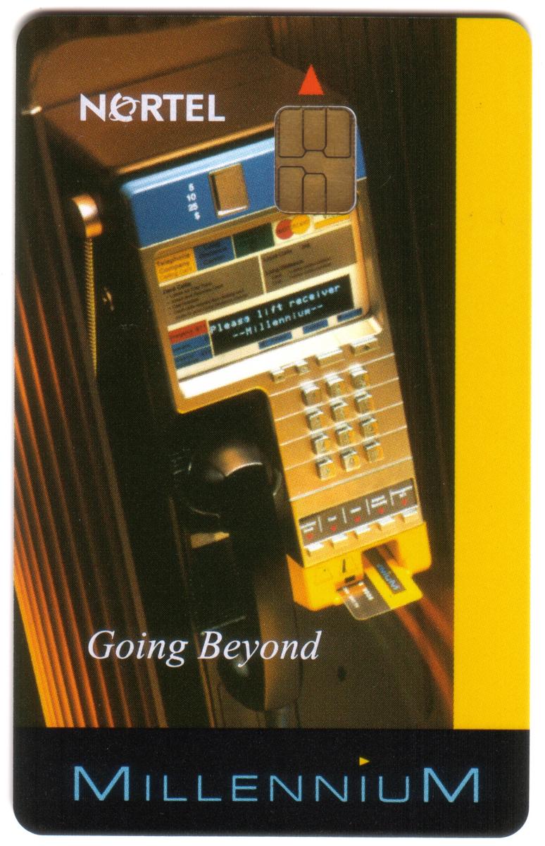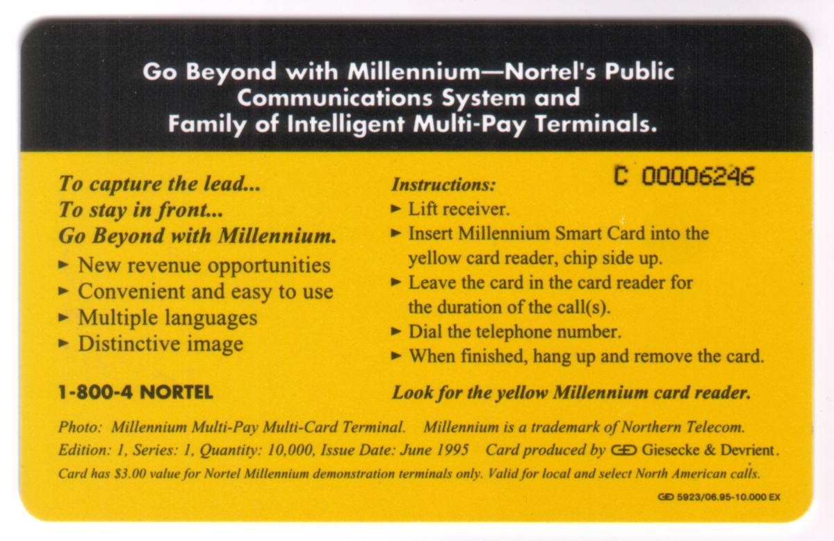 This card relates to Nortel’s Millennium series of intelligent multi-pay terminals, produced by Giesecke & Devrient (G&D), emphasizing advanced stored value chip technology for telecommunications use. The text and visual elements position the card as part of Nortel’s public communications system, dating to June 1995.