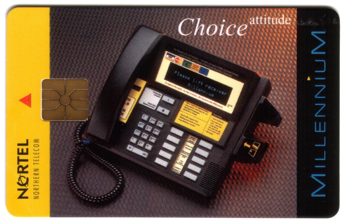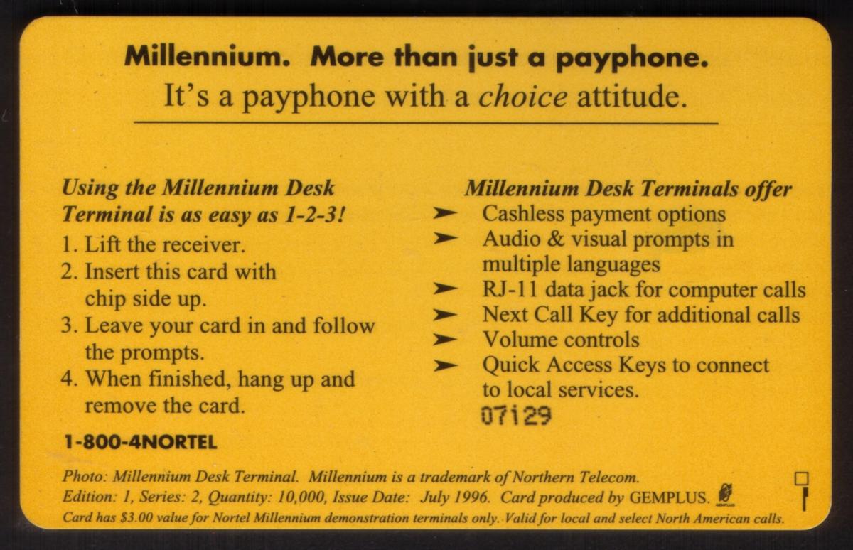 This Nortel Millennium Telephone Promo chip card was released in July 1996. It is a stored value card featuring a gold chip on the left side, which represents the stored value technology used in telephone cards of that era. The card celebrates the Nortel Millennium desk telephone and promotes its innovative features, making it a valuable collectible for those interested in telecommunications history.