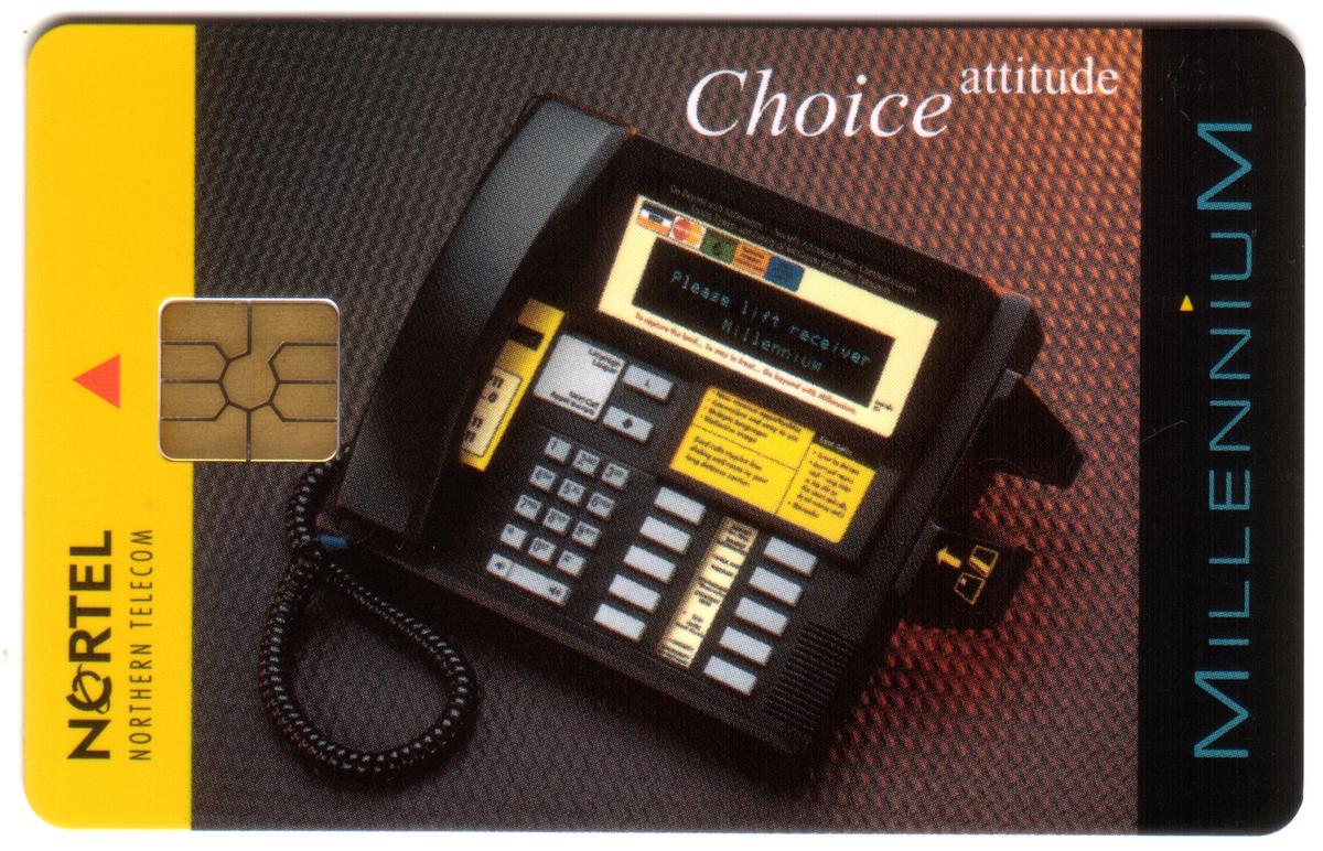 To the left of the card, a vertical yellow strip includes the northern telecom Northern Telecom logo with the text “NORTEL” and “NORTHERN TELECOM” beneath it. The top right area of the card shows the phrase “Choice attitude” in white cursive and printed fonts. On the far right side, the word “MILLENNIUM” is written vertically in blue capital letters against a black background, with a small orange triangle between the syllables.