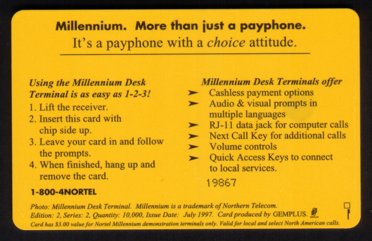 This card is identified with keywords including "millenium," "more than just a payphone," "a payphone with a choice attitude," reflecting the phone’s branding as a modern stored value chip phone card from July 1997. It is associated with Nortel (Northern Telecom), Gemplus chip technology, and represents a promotional chip for the Nortel Millennium Telephone.