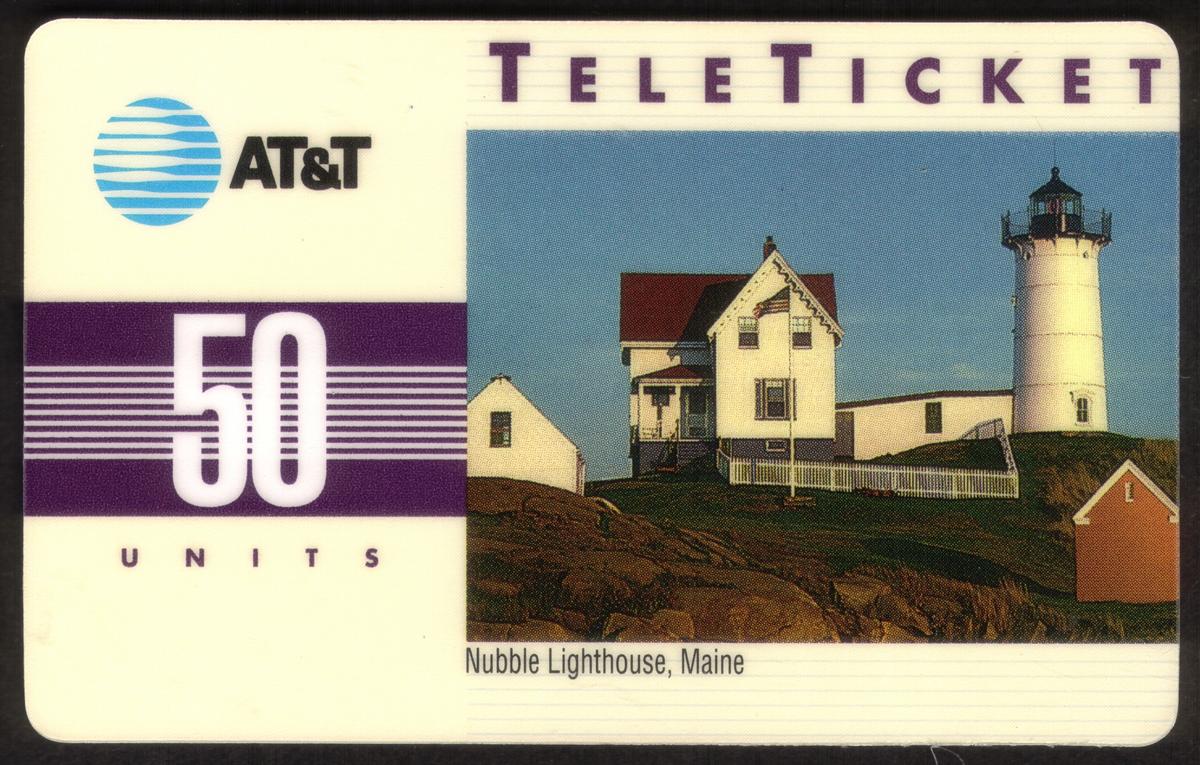 This collectible AT&T Teleticket phone card features a vivid photographic image of the Nubble Lighthouse located in Maine. The lighthouse is shown prominently positioned on a rugged rocky outcrop extending into the ocean. The scene captures bright daylight under a clear blue sky, emphasizing the traditional white lighthouse structure with its red roof and lantern room. Surrounding the lighthouse are patches of grass and rocks, characteristic of the rural American coastline.