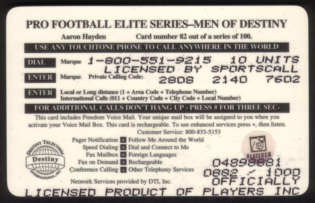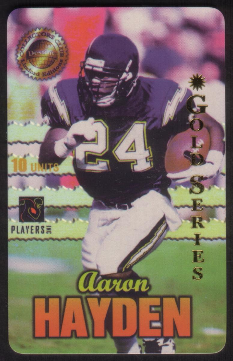 This item is a 10u GOLD Men of Destiny Aaron Hayden RB San Diego collectible from Destiny Telecomm, limited to 100 pieces.