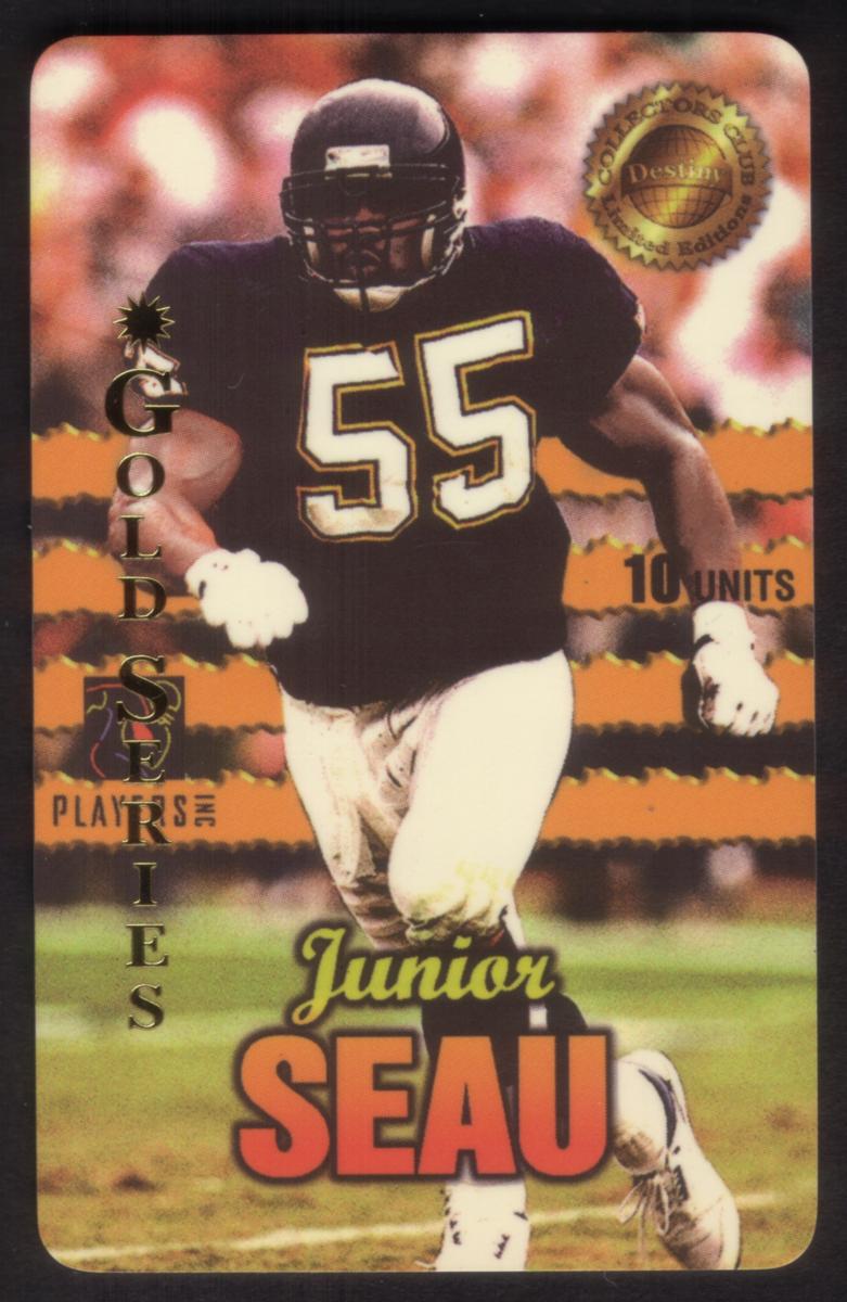 The card is issued by Destiny Telecom and includes the word "Used" on the front, which typically indicates it belongs to a category of football memorabilia. The overall presentation captures the essence of Junior Seau’s impact in the sport and makes this a valuable item for collectors interested in NFL football players, especially those who follow the San Diego Chargers.