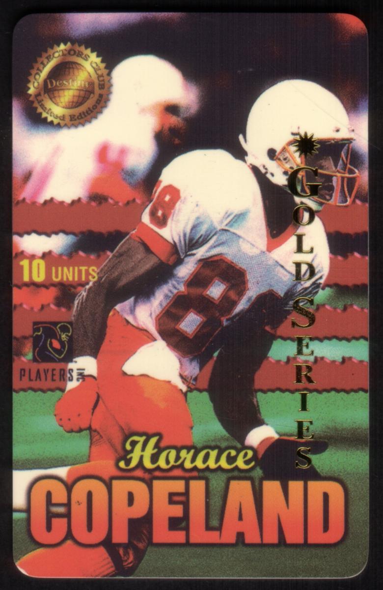 This card is a collectible associated with NFL football players, specifically focusing on Horace Copeland's career. The combination of player imagery, team branding, and limited edition numbering underscores its value to collectors interested in NFL memorabilia.