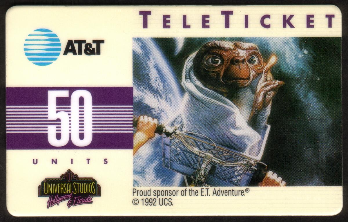 E.T. from Steven Spielberg''s 1982 film, featured on a 1990s Universal Studios phone card with 50 units, promoting the E.T. Adventure attraction. |
