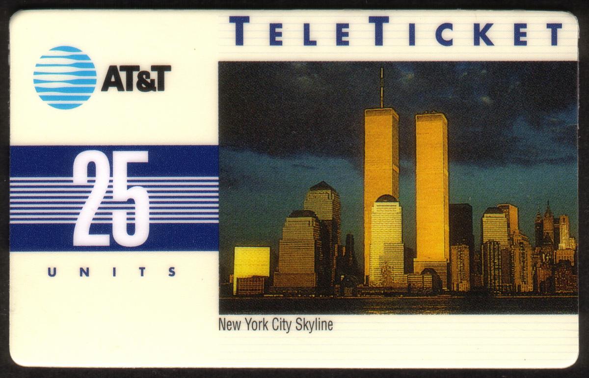 Overall, the card captures a scenic and historic view of New York City emphasizing the Twin Towers of the World Trade Center. It reflects themes of sightseeing and travel, connecting to the keywords “World Trade Center,” “Twin Towers,” “9/11,” “NYC,” and “travel.” The card serves as a collectible item linked to the AT&T Teleticket phone card series.