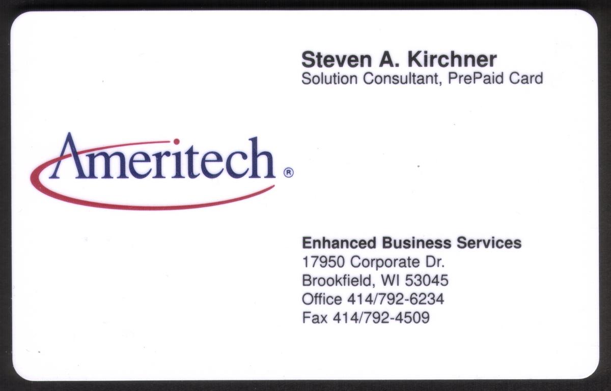 This collectible prepaid card features the name Steven A. Kirchner prominently displayed in the upper left corner, along with the designation "solution consultant." The card identifies the associated business as Enhanced Business Svcs. and includes the company name Ameritech. The card has a clean, professional design that includes the location “Brookfield WI 5U (1997),” indicating the city and state with an additional code and year of issue.