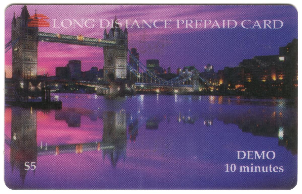 The card bears the logo and name of LDDS WorldCom, a telecommunications company, indicating its affiliation and authenticity. The denomination on the card is $5, and it is designated as a “10m DEMO.” The card’s design uses clean typography to clearly label the location and the issuing entity, reinforcing the theme of sightseeing and historical sites in London.