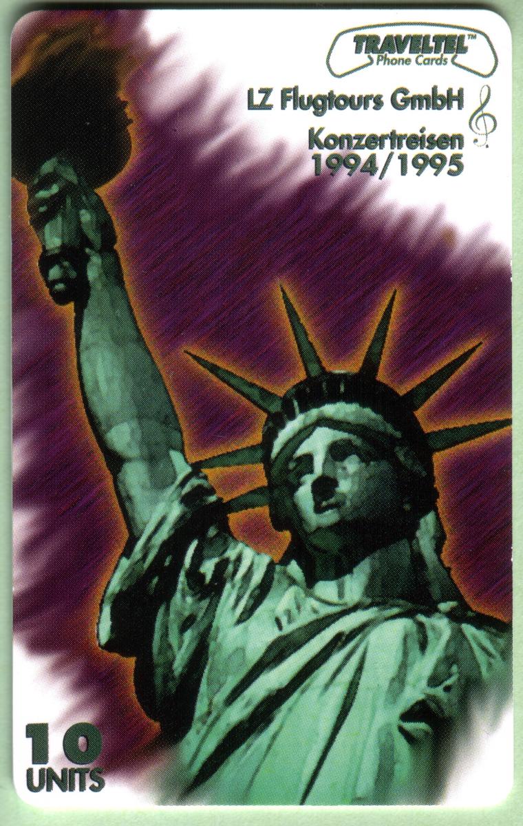 The card includes artistic elements related to music, notably a large treble clef symbol positioned near the top right, integrating a cultural motif with this American historical landmark. The text on the card identifies "LZ Flugtours GmbH Konzertreisen 1994/1995," indicating a connection to concert tours organized by this German travel company during those years. The words “Promotional 10u” appear, suggesting the card’s value or denomination.