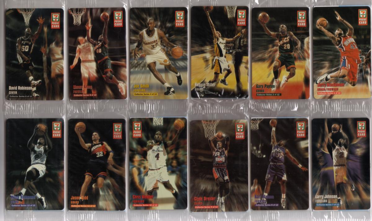 This set of 12 collectible basketball-themed phone cards was issued by 7-Eleven in 1997. Each card features a distinct NBA player in action, captured in dynamic, motion-blurred photographs against a basketball court background. The cards are numbered as part of a "Collector Series" from 1 to 12 and include the player's name, position, and team uniform. The 7-Eleven logo appears prominently in the upper right corner, alongside the words "PHONE CARD" in white text on a red background.