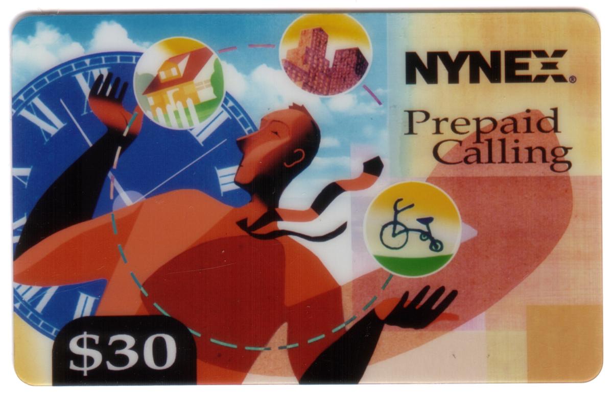 This set of four NYNEX Prepaid Calling cards features colorful, abstract artwork reflecting themes of communication, home life, and modern technology. Each card proudly displays the NYNEX logo and the words "Prepaid Calling" alongside a denomination in white text on a solid black background, ranging from $5, $10, $20, to $30.