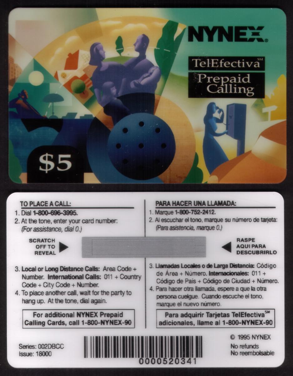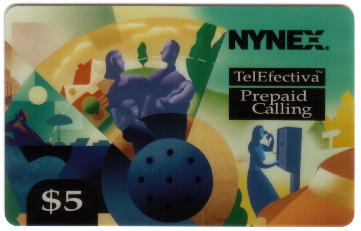 The card includes clear textual elements: "NYNEX" is displayed in bold black letters in the upper right corner, indicating the telecommunications company that issued the card. Below this, the term "TELEfectiva" is prominently printed in a black box with white and teal accents, followed by "Prepaid Calling," specifying the card’s purpose. The denomination of "$5" is set in white on a black background in the lower left corner, identifying the card’s value.