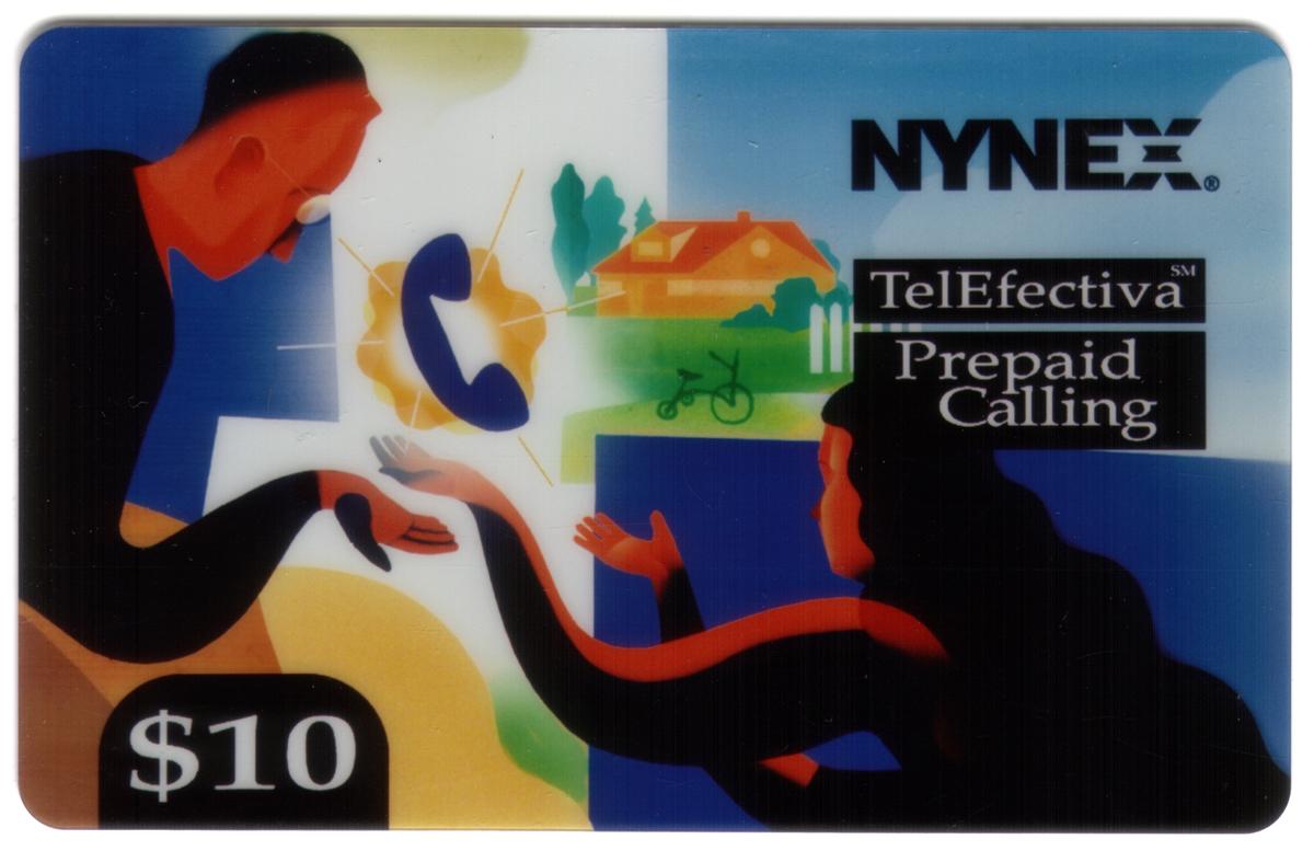 1995 NYNEX prepaid calling card featuring modern art with stylized man and woman, telephone, house, bicycle, bilingual instructions, $10 value. |