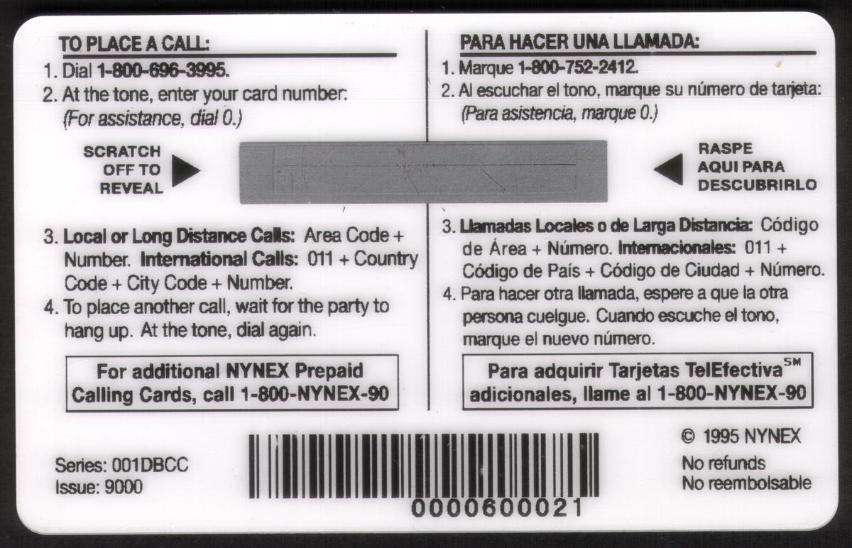 Each card prominently displays its denomination in white within a black box on the lower left corner alongside the logos. This set was released in 1995 by NYNEX for use within their telecommunication services under the Telefectiva prepaid calling product line.