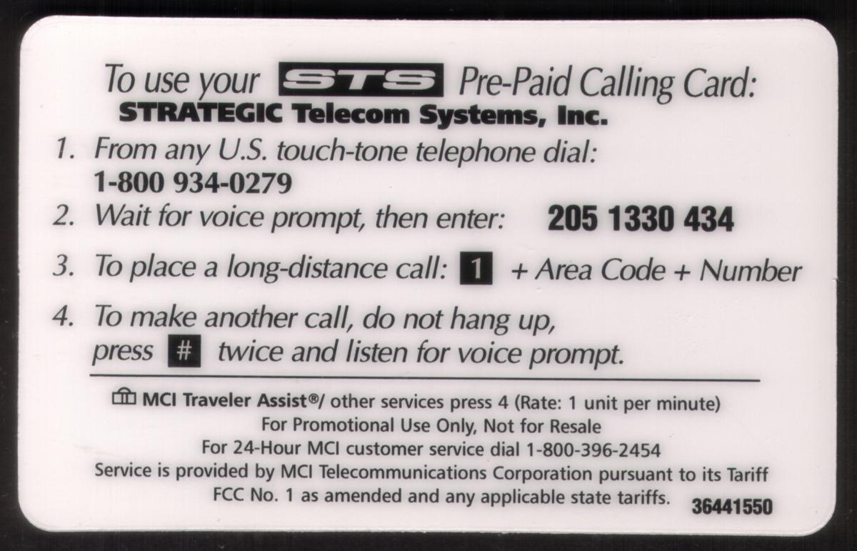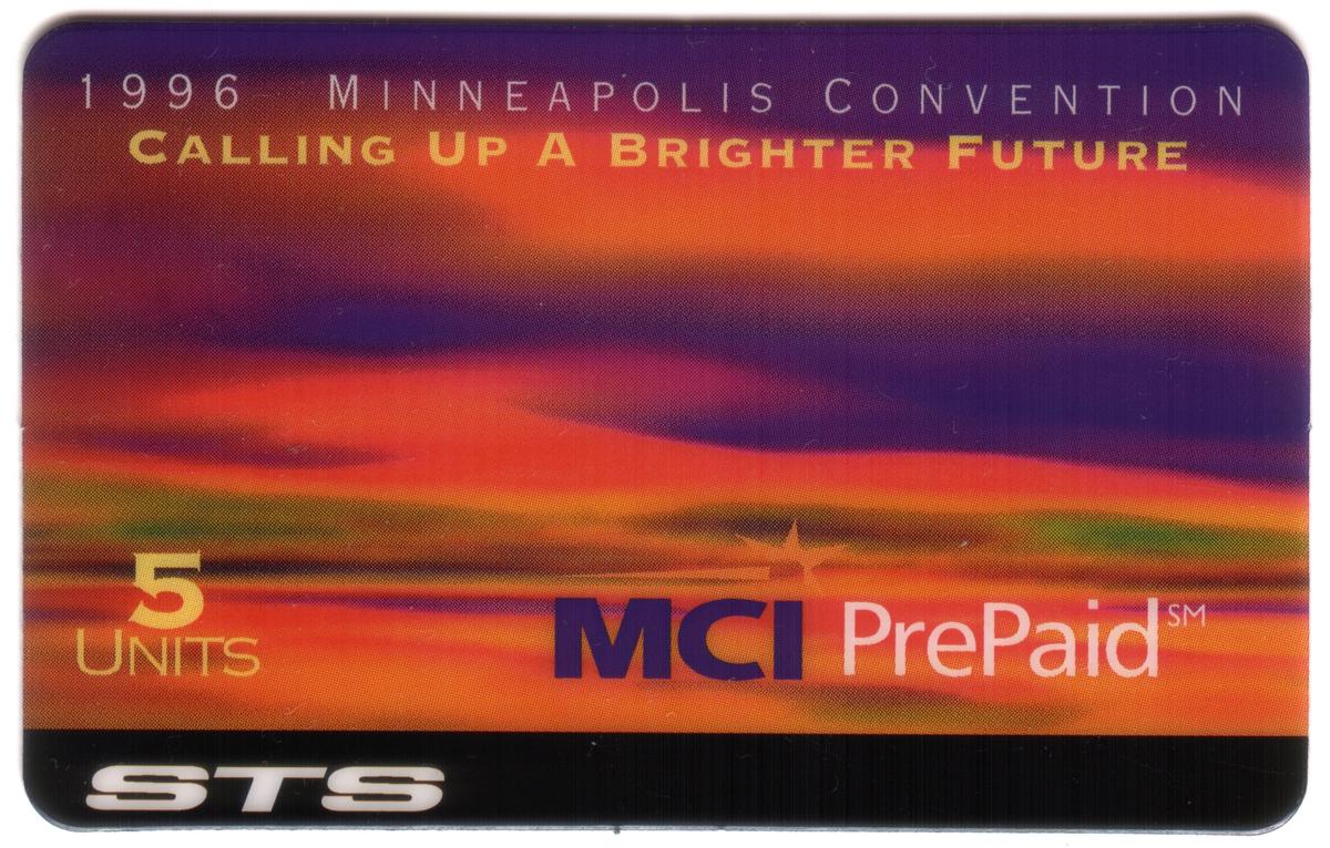 This card represents a piece of telecom history connected to the 1996 Minneapolis Convention and is officially associated with MCI PrePaid and STS services, reflecting the telecommunications industry's developments during that period.